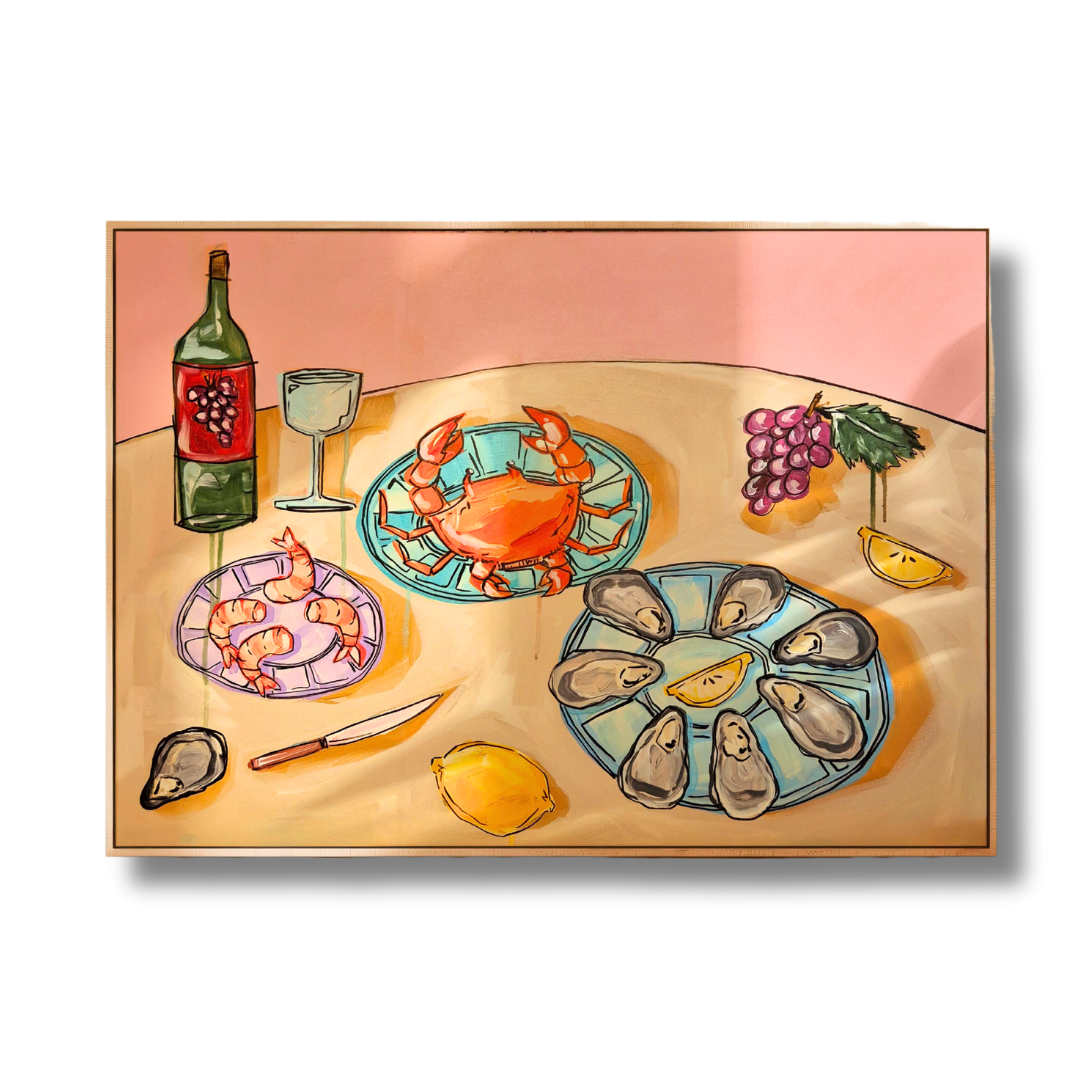- Subject Matter: Seafood, crabs, prawns, oysters, wine, lemons, table, dining, table scape, table setting