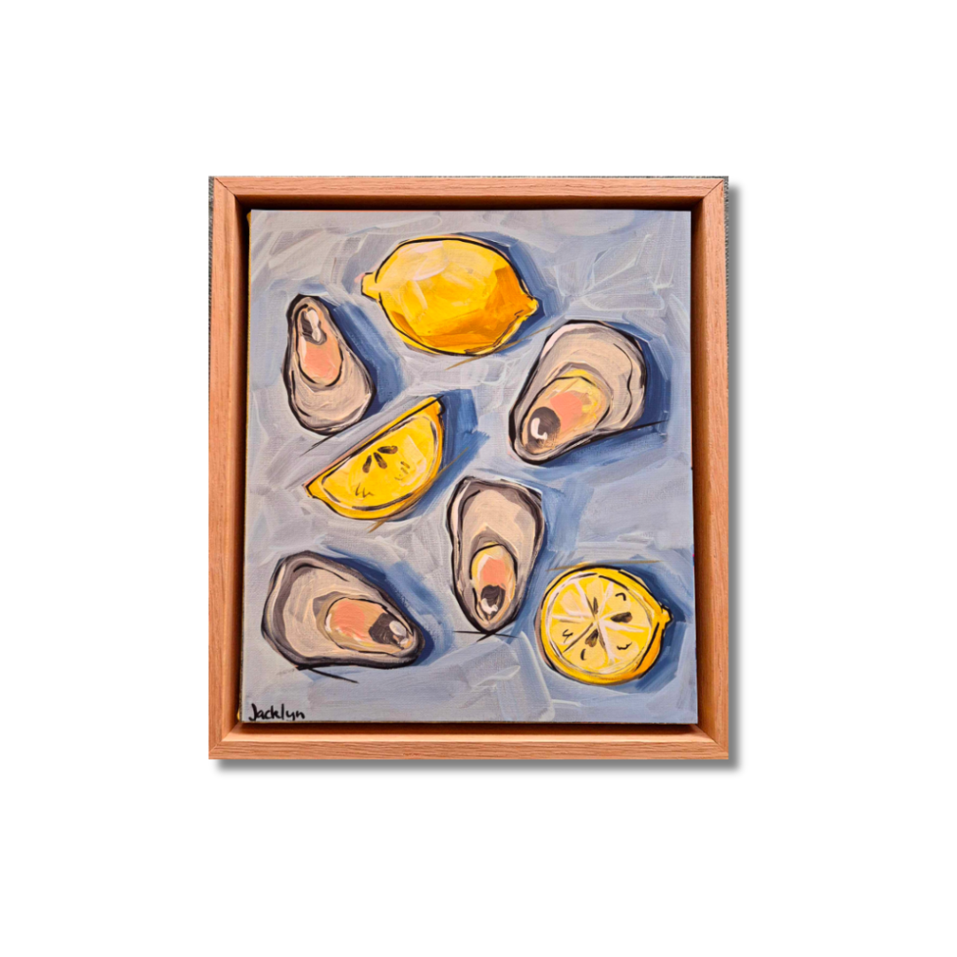 - Subject Matter: Still Life Art, Food & Drink Art, kitchen, dining, colourful, vibrant, playful, fun, light blue, oysters, lemon, citrus, seafood, yellow