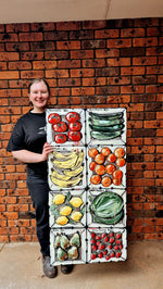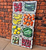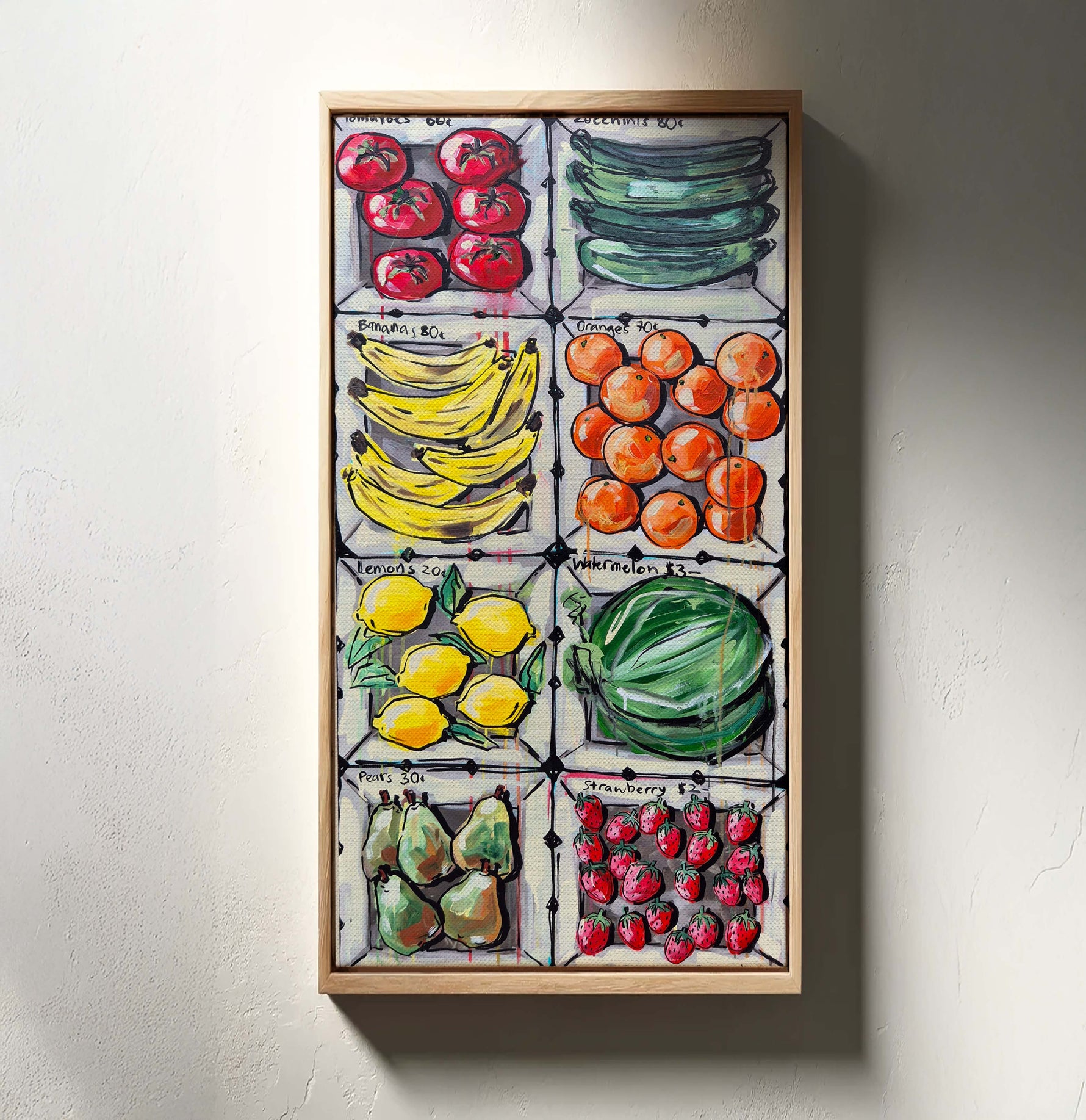 - Subject Matter: Fruit, vegetables, fruit market, farmers market, still life, kitchen, kitchen art, bananas, apple, pear, lemon, citrus, oranges, orange, watermelon, pears, strawberries, strawberry