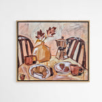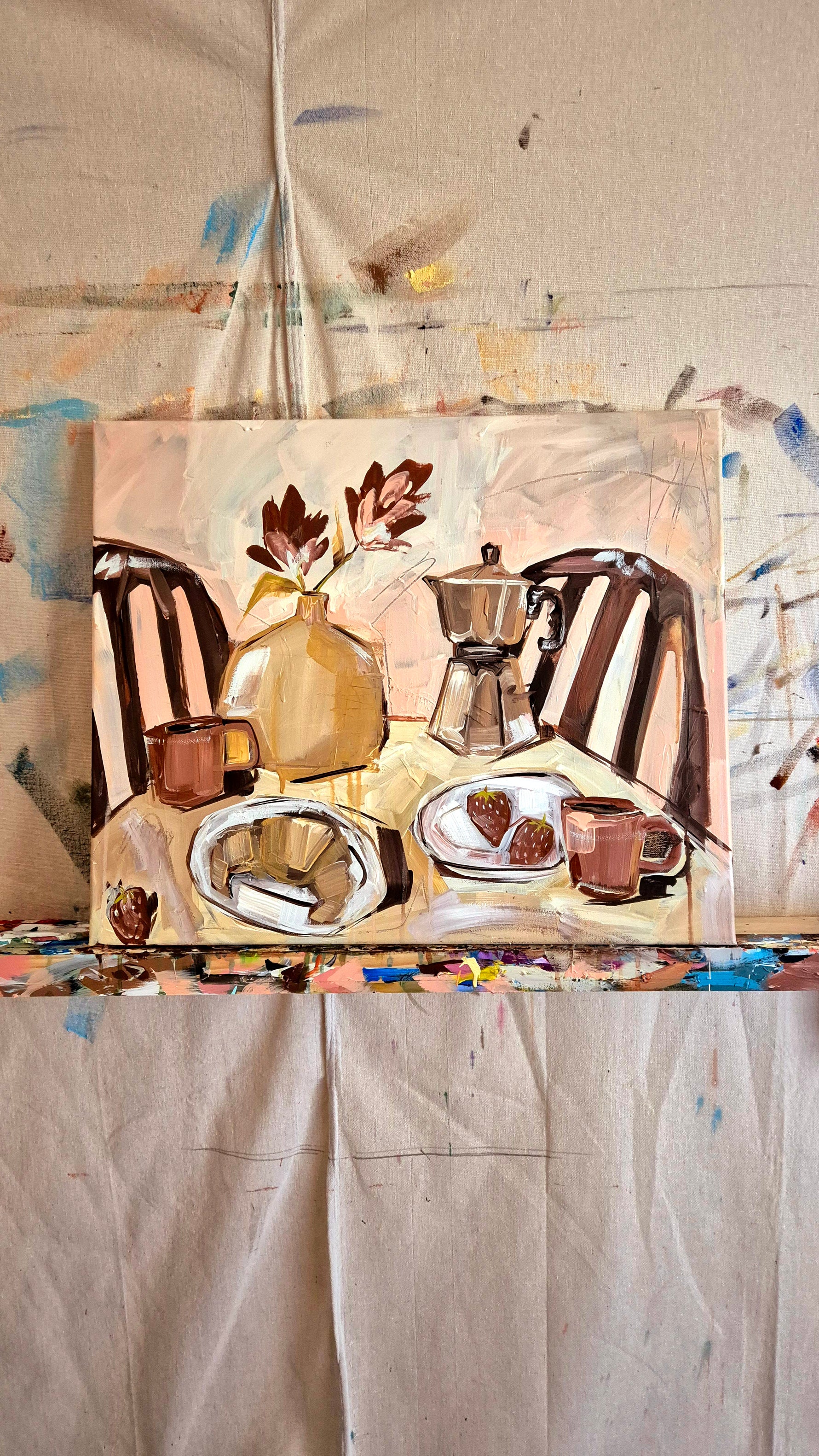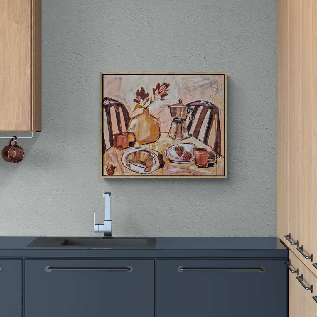 - Subject Matter: Table setting with a vase, flowers, coffee, moka pot, croissants, strawberries, mugs
