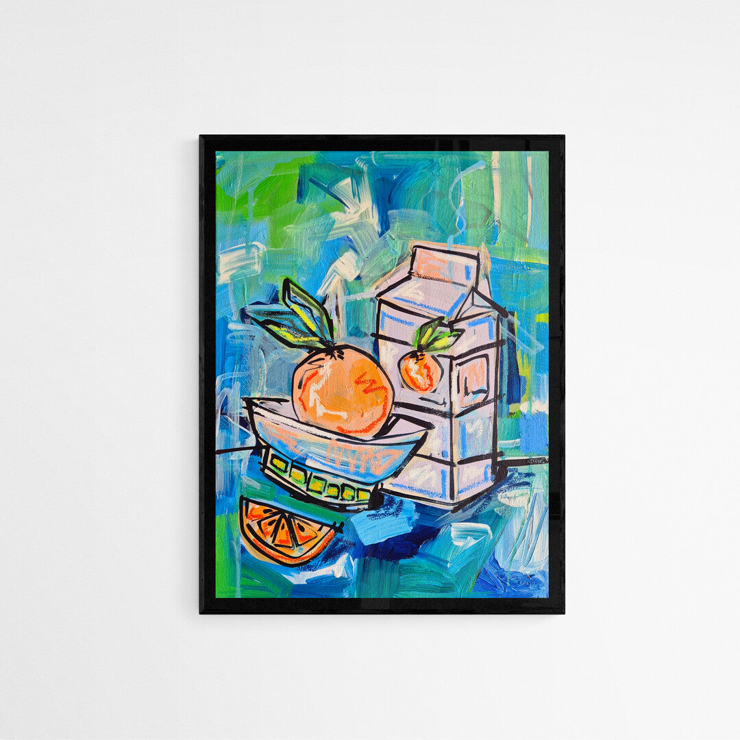 - Subject Matter: Orange juice carton, citrus wedge, bowl, orange